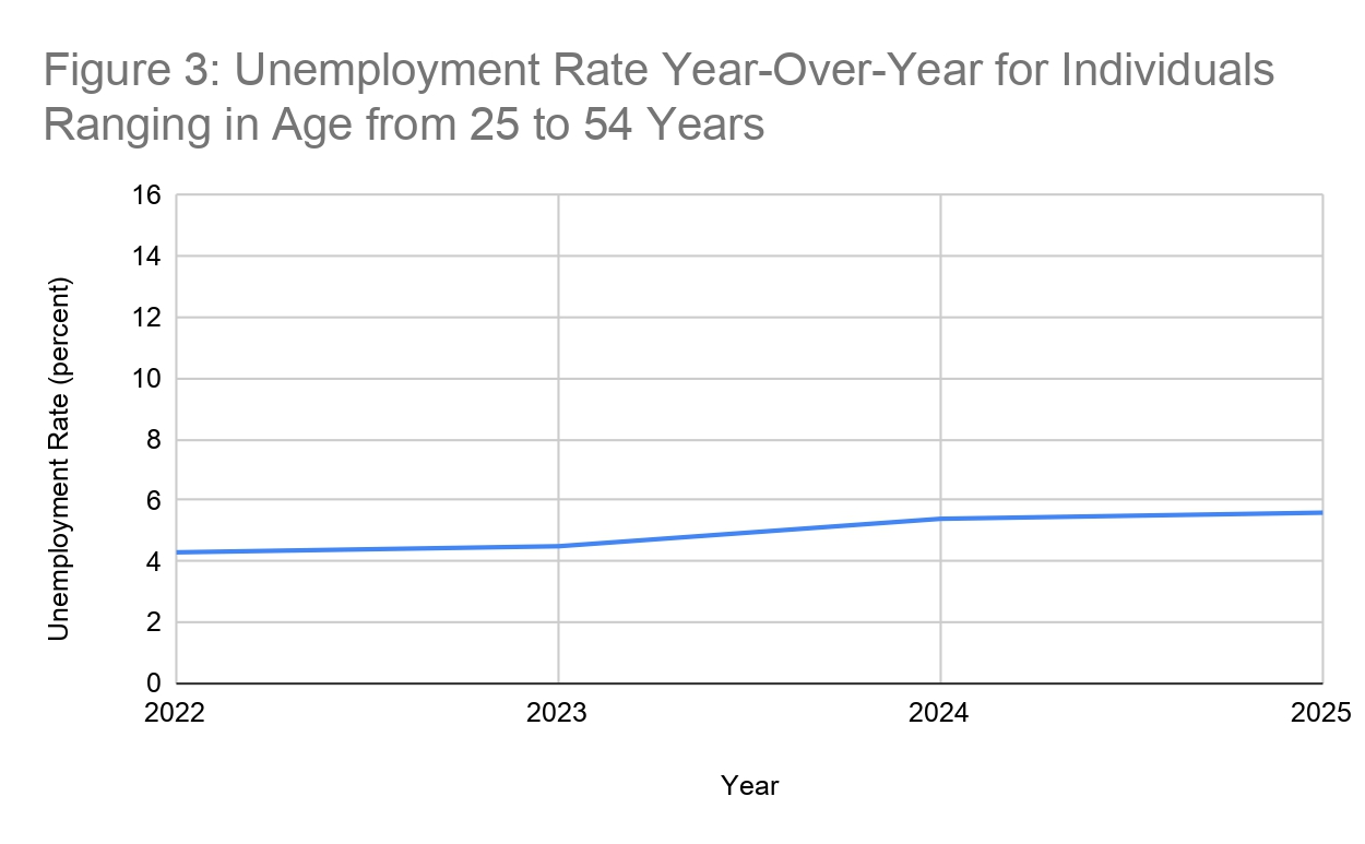 Figure 3: Canadian unemployment rate over post-COVID years for individuals ranging in age from 25 to 54 years. Since 2022, unemployment for this demographic has increased by 30% (Statistics Canada, 2025).