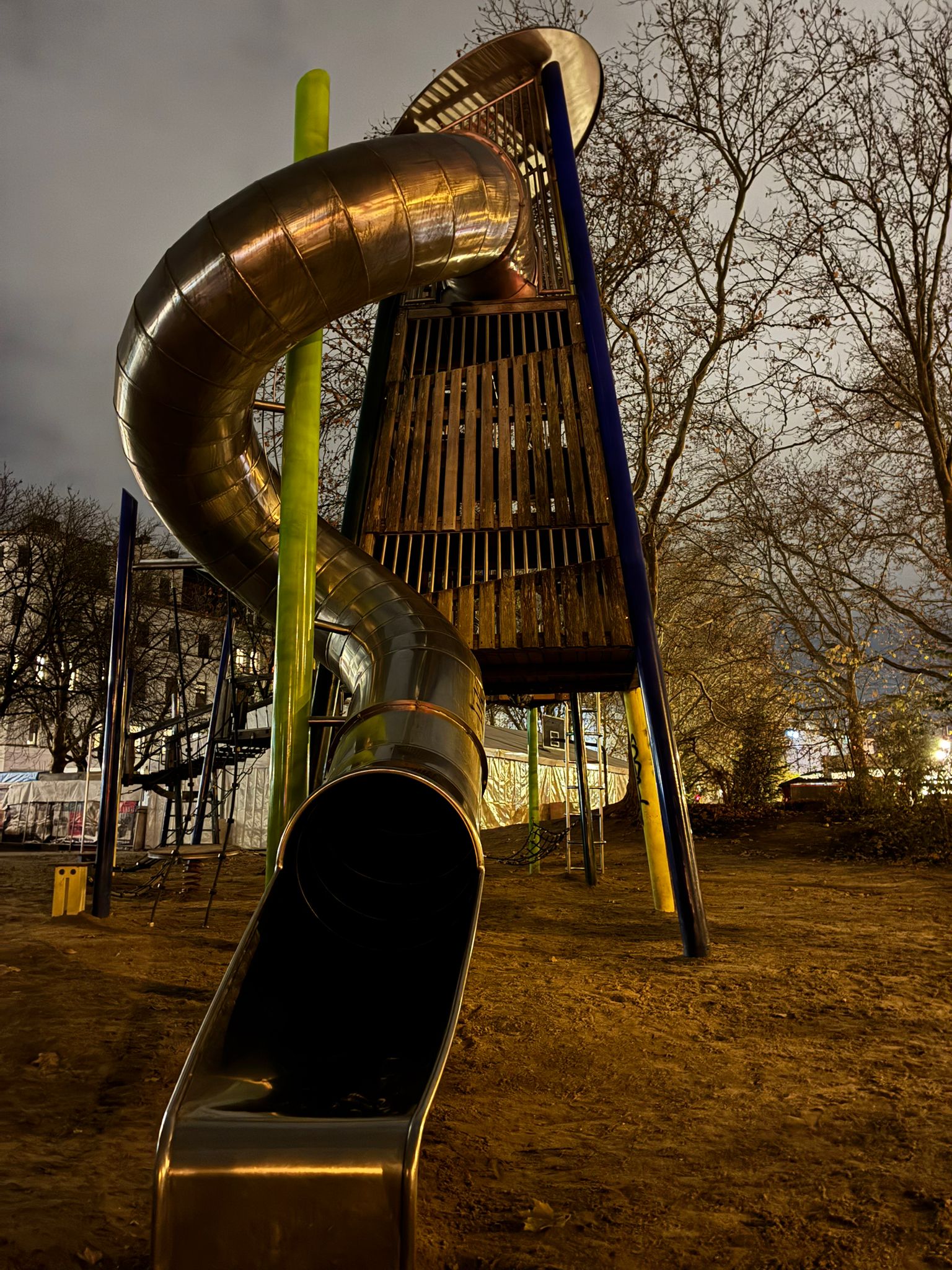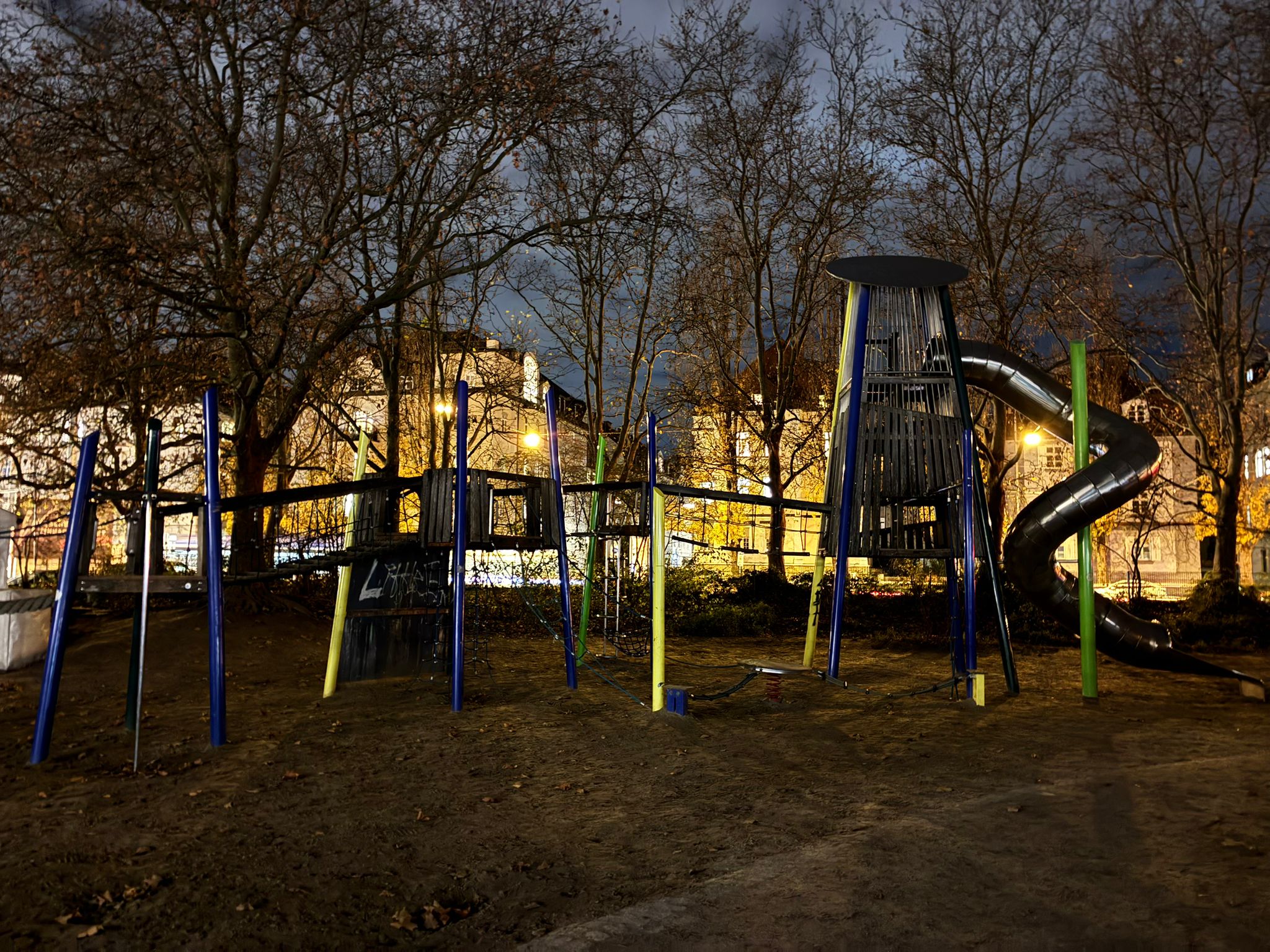 Lukas Heindl. Playground in Maxvorstadt, Munich, Germany. Playground structure with a large slide and a steep incline. Flooring is comprised of packed dirt and sand. November 20, 2025. Personal Photograph.