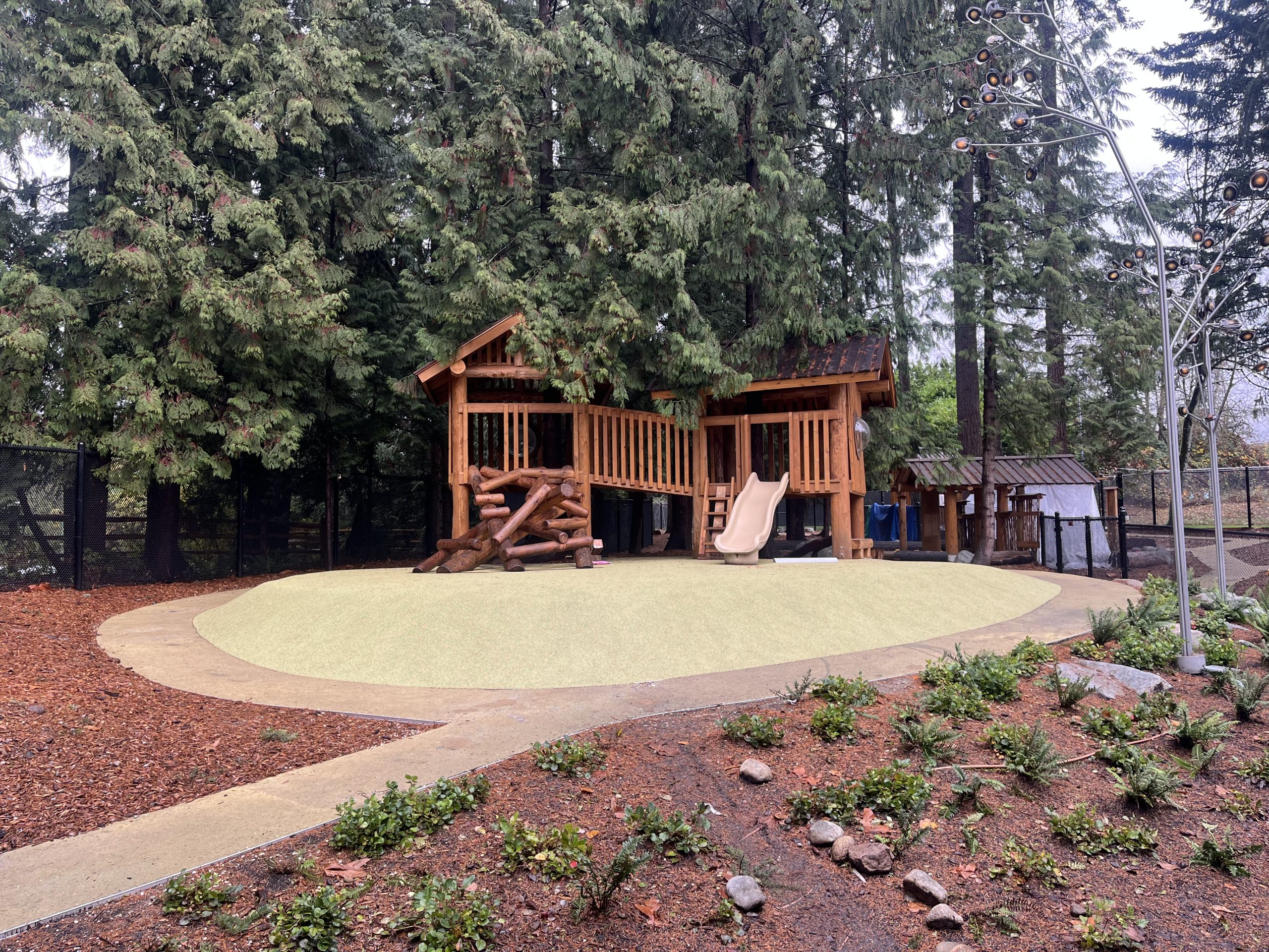 Playground located in a day care centre at Capilano University for children up to the age of 5. After speaking with one of the supervisors, I was told that the safety inspector flagged the log structure on the right as too dangerous. November 17, 2025.