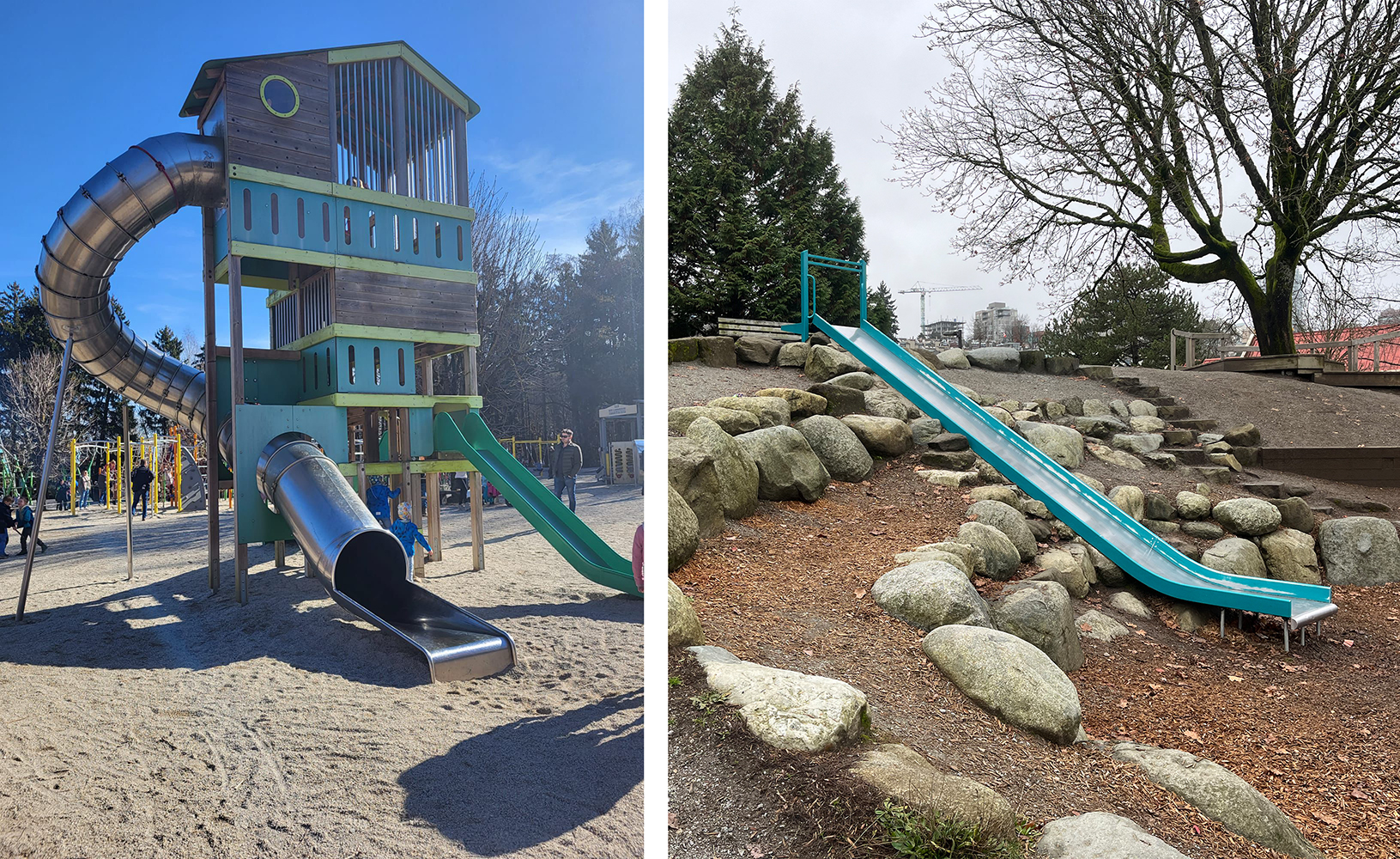 Right: Slide at False Creek, Vancouver, BC, playground. Reduced slope and shock-absorbing ground show demonstrate standards in BC playgrounds. November 16, 2025.