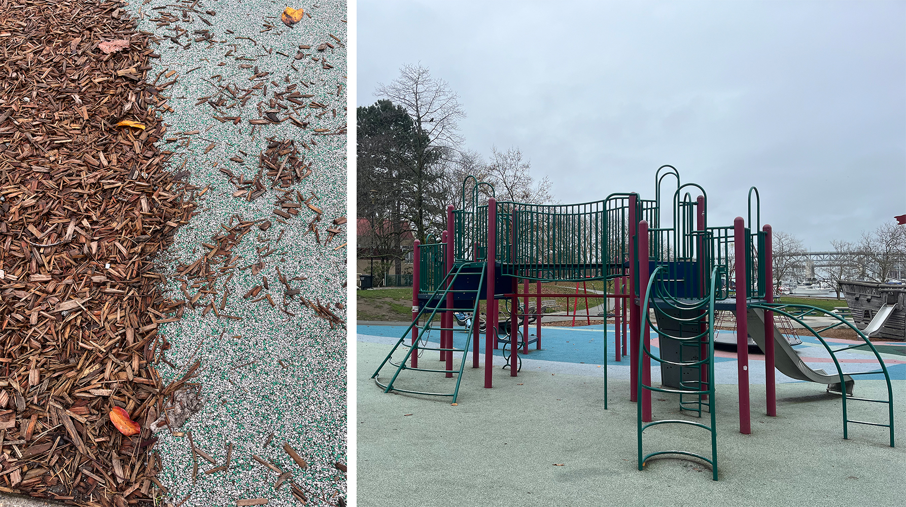 Left: Flooring of playground in False Creek, Vancouver, BC. On the left, we see tree mulch, which signifies the edge of the playground, and on the right, the shock-absorbing rubber required for fall heights greater than 40 cm. November 16, 2025.