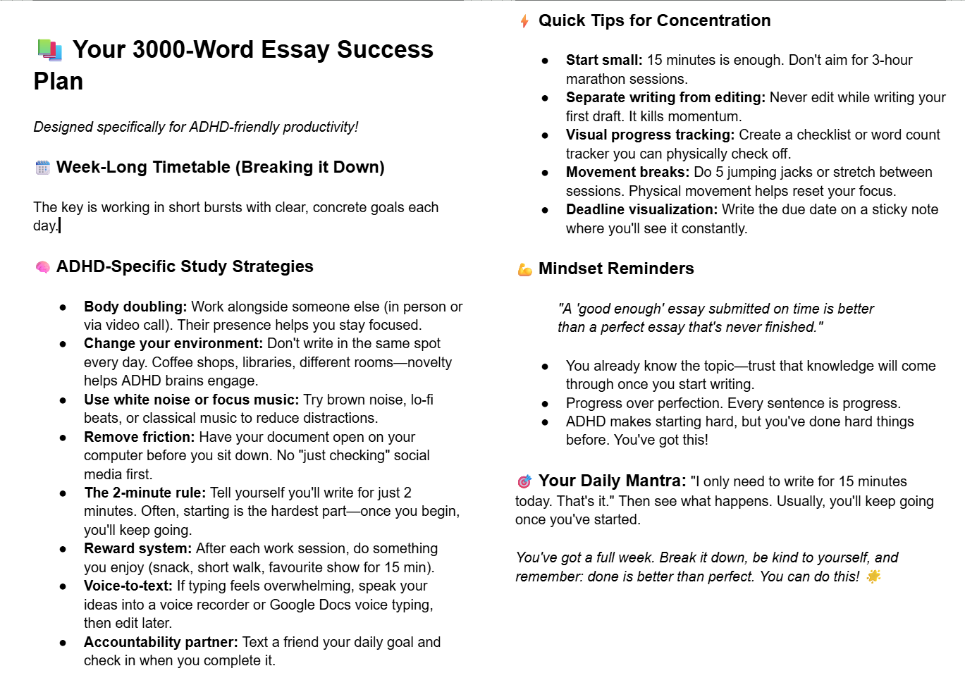 Notion AI. (2025, December 2). Response to [Hi! I’m having a hard time feeling motivated enough to write a 3000-word article due to my inattentive ADHD. Can you create a study guide so that I can finish this project in 7 days? Thank you :)]. Notion Labs. [Screenshot taken by Gorkey, E.].