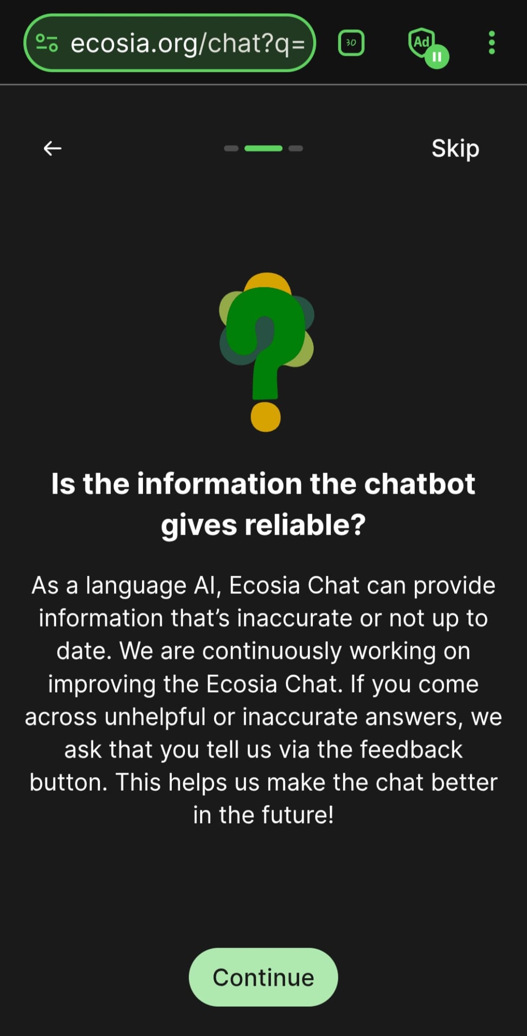 Ecosia AI’s response upon its user selecting the feature for the first time. Note: Screenshot taken October 27, 2025.