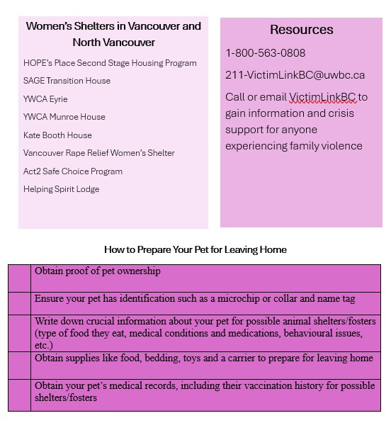 People form close emotional bonds with their companion animals, with this source of comfort being especially important for those experiencing domestic violence. This close bond is often taken advantage of by abusive partners. Many women who have reported experiencing domestic violence also stated that they either delayed leaving their abusive partner (Barbosa-Torres et al., 2024) or returned to the violent home (Monsalve et al. 2017) out of fear for their animal’s safety. The delay in leaving these unsafe situations is most commonly due to the lack of facilities available for the pets of domestic violence victims. In a local context, “less than half of the shelters in BC are pet-friendly” (About Warm Hearts, n.d.), causing 56% of survivors to delay leaving violent environments (About Warm Hearts, n.d.). While it varies on a case-by-case basis, the most frequent reports of animal abuse by a violent partner include “threats, physical abuse and prohibiting the supply of basic resources, mainly food, water and/or veterinary care” (Monsalve et al. 2017). The use of violence against companion animals as a method of psychological control perpetuates a cycle of violence in the home that can lead to serious developmental issues in children that witness this, encouraging further violent behaviour as they reach adulthood.