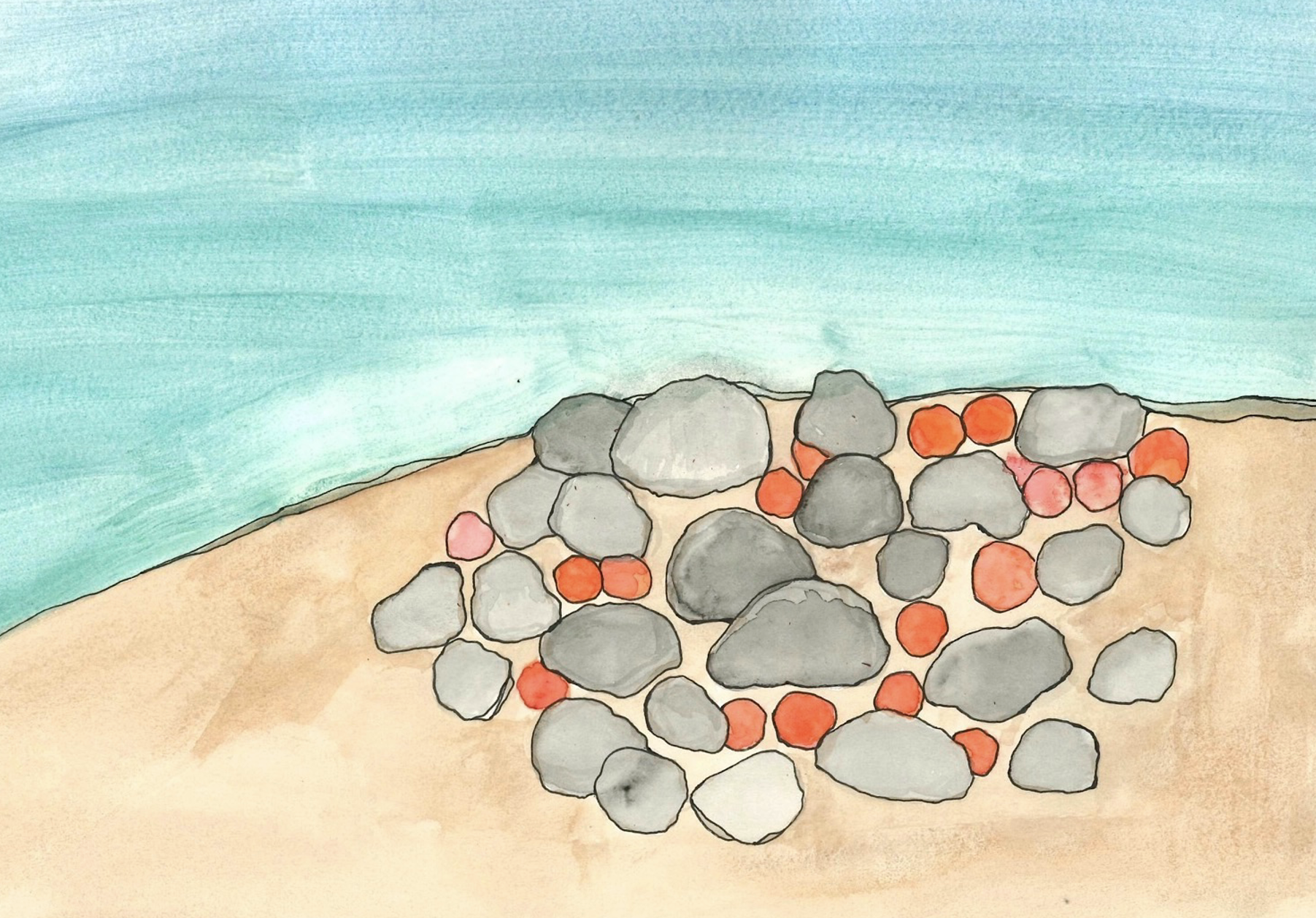 A watercolour depiction of a Salmon REDD nest in a riverbed. A REDD nest contains a group of salmon eggs (small orange spheres each measuring approx. 1/4 -1/2 inch) which are laid in ‘nests’ amongst patches of gravel and small rocks suitable to house and protect eggs as they undergo their incubation period. REDD’s are highly sensitive to ecological changes and disturbances.