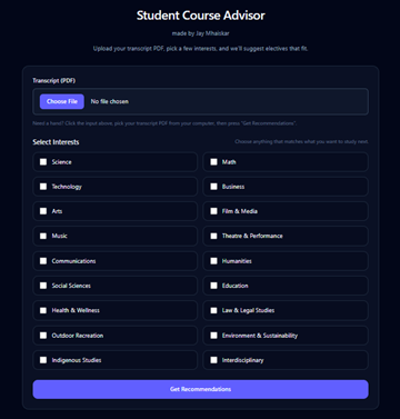 The goal of this project was to create a tool that helps students navigate elective selection with more clarity and less frustration. The system takes the student’s unofficial transcript in PDF format as the input and extracts the course code, course name and letter grade. I chose to use the unofficial transcript because it avoids student data concerns. It doesn’t include a name or student ID, it’s free, and it can be downloaded online without restrictions. I also don’t store any processed information in a database. Working this way helps me avoid ethical issues since the transcript contains no identifiers and none of the processed data is collected. The bot also asks students to enter their areas of interest, which helps narrow down the suggestions to courses they are more likely to enjoy. The prototype currently runs through a terminal environment with a Python FastAPI backend and a React native frontend to deliver a clean user interface where students can upload transcripts, enter interests, and receive a structured list of eligible electives.