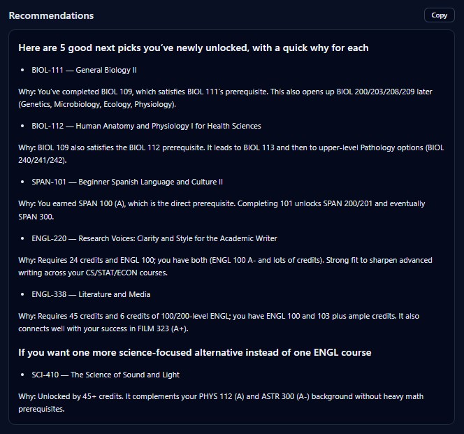 A tool like this can make a real difference for students who feel overwhelmed by the number of electives available or unsure about how prerequisites and credit structures work. Instead of scrolling through hundreds of course descriptions, students can arrive at an advising meeting with a small list of classes that fit their goals and academic background. Both Urmila and Alex noted that this kind of preparation would make advising conversations more focused and productive.