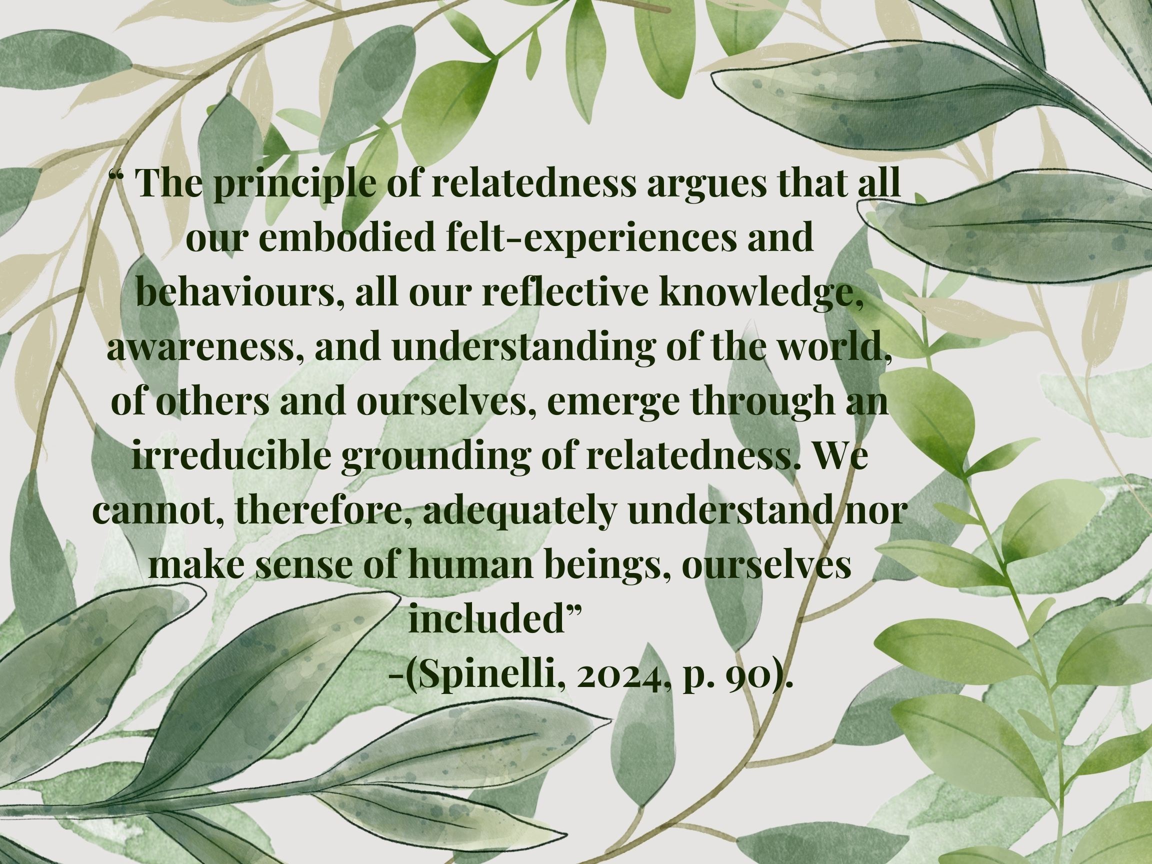 The principle of relatedness…” This quote captures the essence of how all Knowledge, reflection, and action emerge through connection– resonating with my experiences as a student, mental health worker and human being.