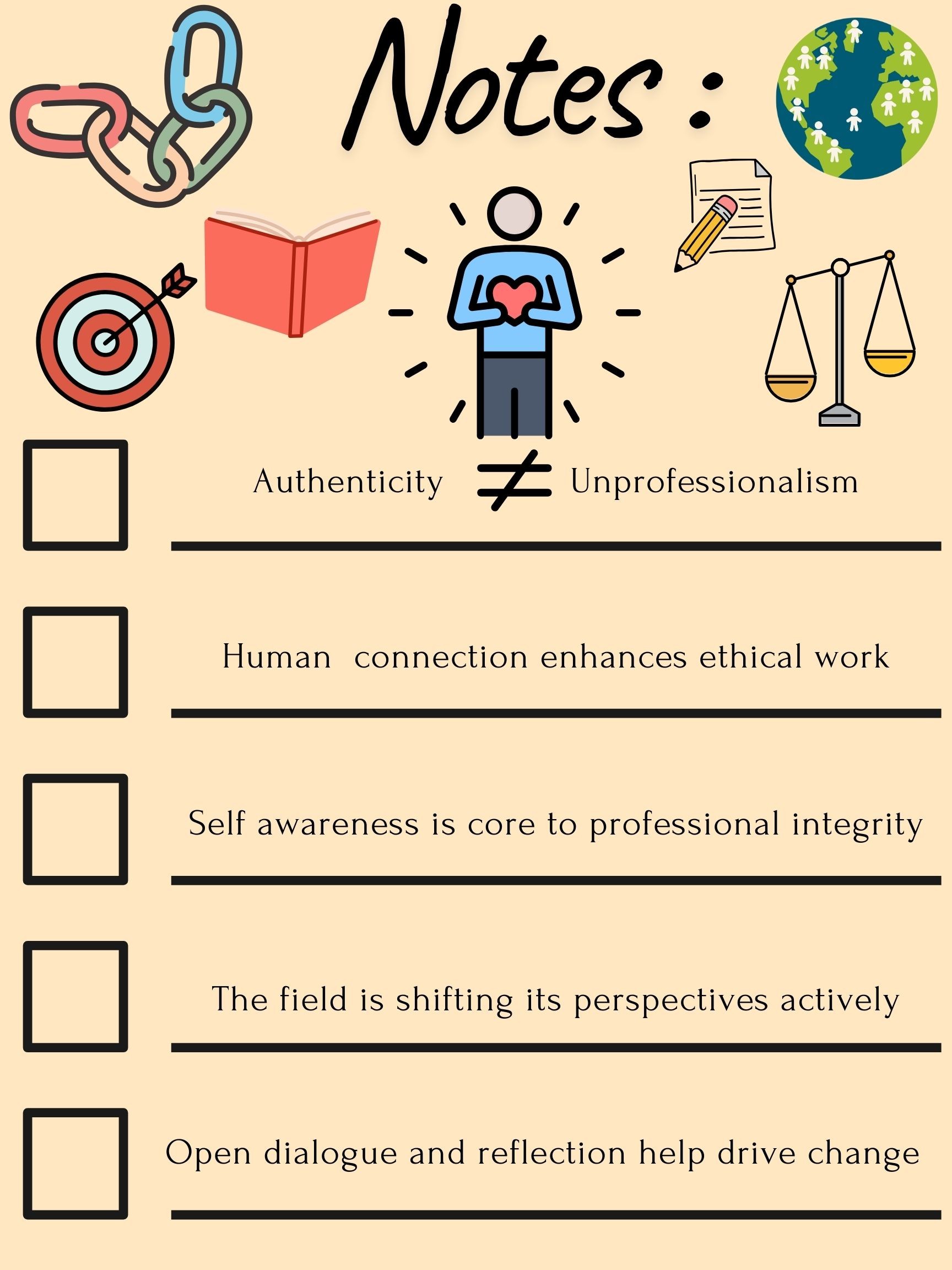 Key reminders and reflective prompts that guided my thinking and kept the focus on relational presence and authenticity throughout this project.