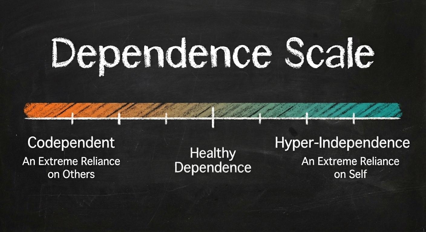 By examining hyper-independence on the dependence spectrum, alongside its counterpart of codependence, we can see that healthy relationships rely on a balance of giving and receiving support. When this balance is disrupted, whether by cultural pressures emphasizing individual achievement or by formative experiences that discourage vulnerability, hyper-independence can emerge as a maladaptive survival strategy rather than a genuine expression of autonomy.